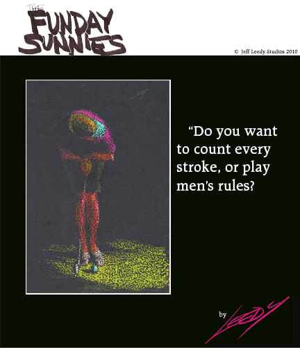 Coming to you from the crossroads between art and humor, Jeff Leedy’s Do You Want To Count Every Stroke? Or Play Men’s Rules? is our Work of the Week. An award-winning fine art humorist whose portfolio includes his Funday Sunnies series, Leedy won a gold medal in the New York Society of Illustrators’ inaugural Humor Show and has exhibited at hundreds of festivals across his decades-spanning career. His artwork can be found in private collections and galleries all over the world.