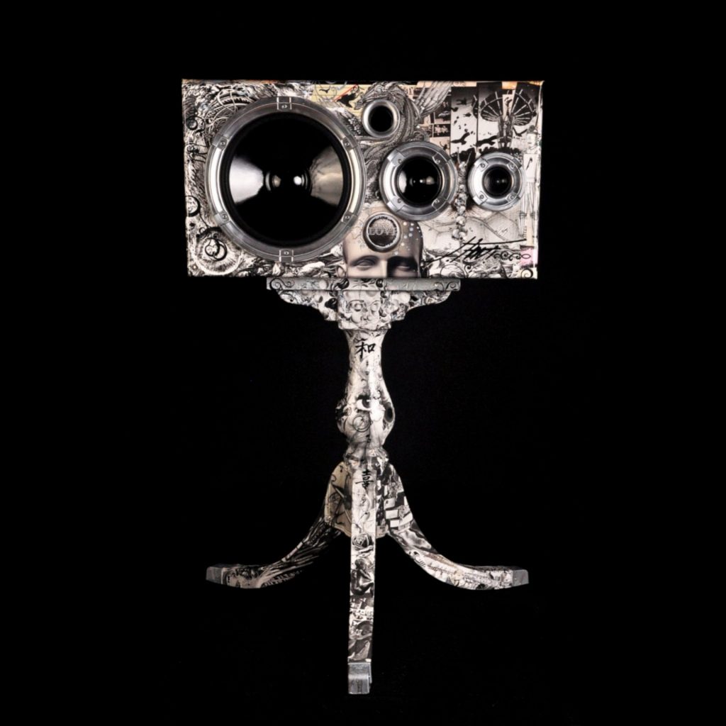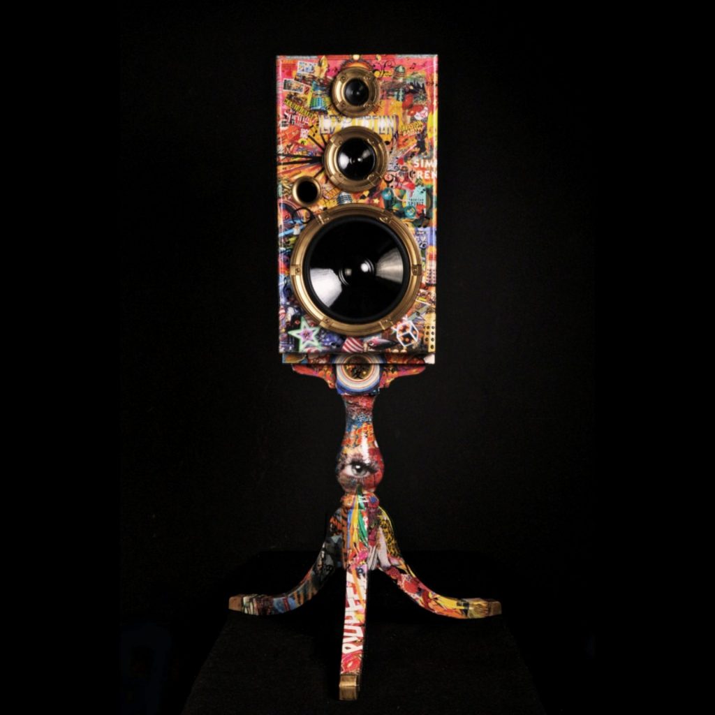 A: Most of my work has been some divine intervention. God has blessed me and honestly, I roll day by day. The art just happens organically and when I need cash I push a bit. I archive images that interest me from tear sheets, books, magazines, any form of mixed media even garbage I find on my litter cleanups and create. I love commission work because it sharpens my focus and pays well. I will collage by hand with images and Mod Podge on multiple surfaces. In the beginning, I started on plywood or canvas. I found collage on a hard surface was a faster process so I started gluing tables, cabinets, walls, SPEAKERS, and who knows what’s next. I have been on a POPART series for some time, mostly musicians. I love music and will admit it was my first love. The art flows really well and does not feel heavy or frustrating which past pieces have. The eyeballs are changing so my style has been as well. “City of the Century” was the beginning of a new technique and I love the way they look.