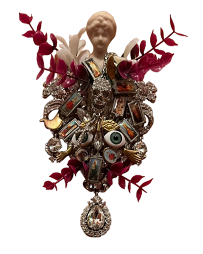 Rhinestone skulls are a repeated theme across Vega’s brooch art–dangling, glued, popping–celebrating life and the afterlife’s miracles, seeking guidance and protection from the saints and spirits, of those here, and those who have crossed over.